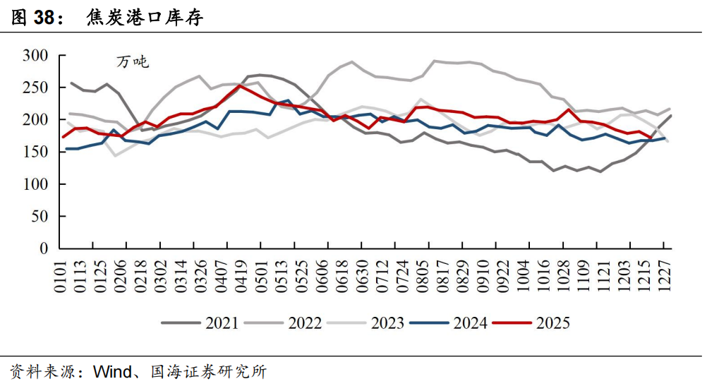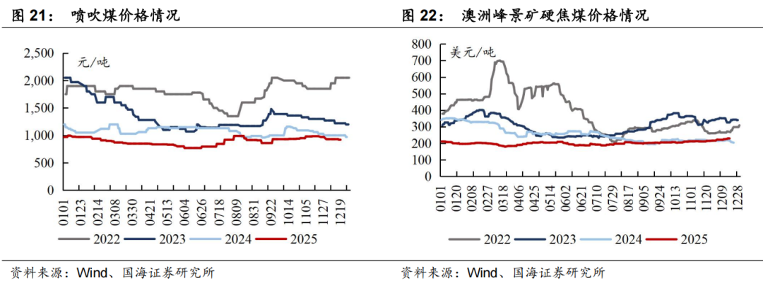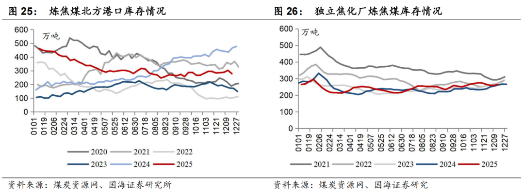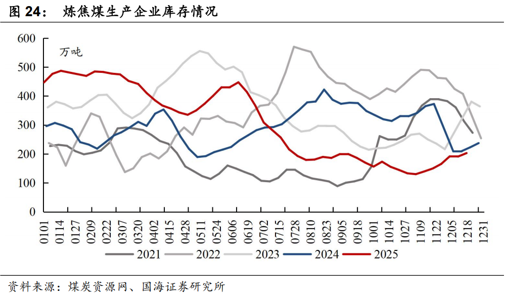 动力煤来看,12月19日北方港口动力煤703元/吨(周环比下降42元/吨)。具体来看,(1)生产端,截至12月17日,三西地区样本煤矿产能利用率环比降低1.94pct,主要系部分矿井完成年度生产任务而停产减产所致。(2)运输端,本周市场发运环比分化,大秦线日均发运量周环比减少12.61万吨,呼铁局日均批车数周环比增加2列。(3)进口煤方面,印尼降雨影响开采之下供应略紧,并有部分空单回补需求,价格跌幅收窄,进口性价比收窄。另外,印尼政府计划自2026年起实施税率1-5%的煤炭出口税,预计将推高到货成本从而削弱印尼低卡煤价格优势。(4)需求端,本周六大电厂日耗周环比下降0.6万吨。(5)电厂库存方面,12月19日六大电厂库存1374.6万吨,较去年同期下降23.7万吨。(6)非电需求端,本周非电行业维持刚需采购,化工耗煤本周环比上升0.35%,铁水产量本周环比下降2.65万吨至226.49万吨。水泥开工率截至12月11日环比上升0.08pct。(7)港口端,本周北方港口库存环比提升63.20万吨。整体来看,受部分矿井完成年度生产任务停减产影响,本周生产收紧。但需求端,下游电厂日耗爬升速度一般,贸易商采购积极性受港口煤价下跌影响较弱,使得本周港口库存环比继续增加,叠加坑口成本支撑转弱,本周港口煤价环比下跌42元/吨至703元/吨。后续来看,供给端,年末生产仍有减量,需求端,今年春节较晚,后续气温仍有下降空间。同时,近期随着价格调整较多,坑口挺价意愿增强,煤价有望逐步止跌企稳。关注后续天气降温、坑口价格与港口库存情况。