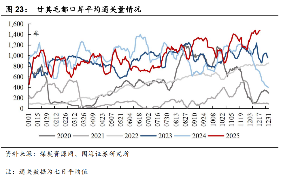 本周甘其毛都口岸平均通关量环比下降:截至12月18日,甘其毛都口岸平均通关量为1473车(七日平均值),周环比下降5车。