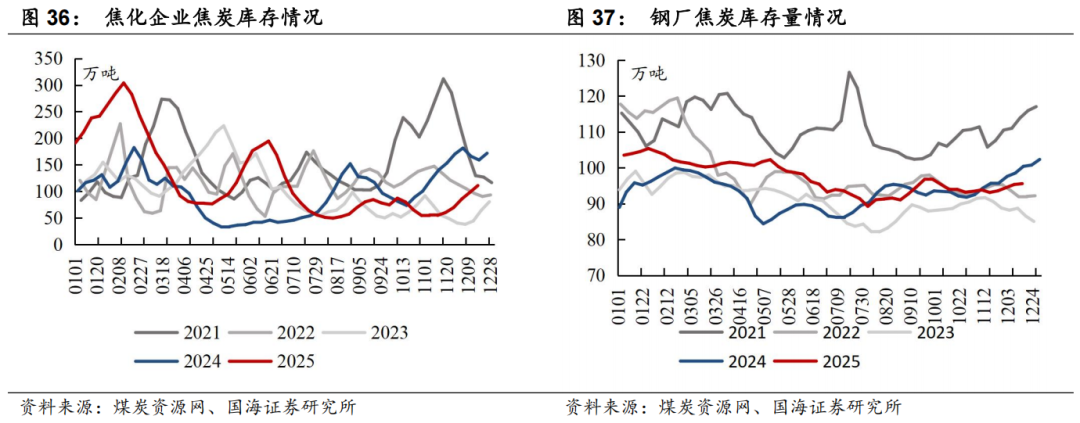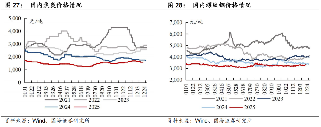 炼焦煤和焦炭来看,对于炼焦煤,12/10-12/17样本煤矿产能利用率环比下降0.27pct至83.0%,主要系完成年度生产任务而减产的煤矿继续增加所致。蒙煤方面,本周甘其毛都口岸通关车数延续高位运行,12月11日-12月18日甘其毛都口岸平均通关量为1,473车(七日平均值),周环比下降5车。需求端,铁水产量本周环比下降2.65万吨至226.49万吨,焦企原料库存持续消耗至偏低水平,补库刚需即将启动。库存端,本周焦煤生产企业库存环比上升11.90万吨。整体来看,本周生产小幅收窄,蒙煤进口维持高位。铁水产量延续季节性下滑,焦企刚需补库逐步启动,本周矿山库存小幅累积,截至12月19日,港口主焦煤价格1,740.00元/吨(周环比上升110.00元/吨)。展望后续,年末供给或有下滑,蒙煤进口增量有限,煤价企稳后下游将陆续开展冬储补库,供需矛盾有望边际改善,关注冬储补库节奏、铁水产量变化、坑口及口岸库存等表现。对于焦炭,供给端,前期因环保限产或检修的煤企复产,亦有煤企受环保影响而进入限产,综合影响下本周焦企产能利用率环比小幅下降0.01pct至74.32%。需求端,铁水产量铁水产量本周环比下降2.65万吨至226.49万吨,高炉检修增加之下钢厂原料需求减少,采购节奏有所放缓。库存端,本周独立焦化厂焦炭库存环比提升。整体来看,焦炭市场偏弱运行,本周五焦炭开启第三轮提降,价格短期或偏弱整理,后续同样关注冬储补库以及上游煤价情况。