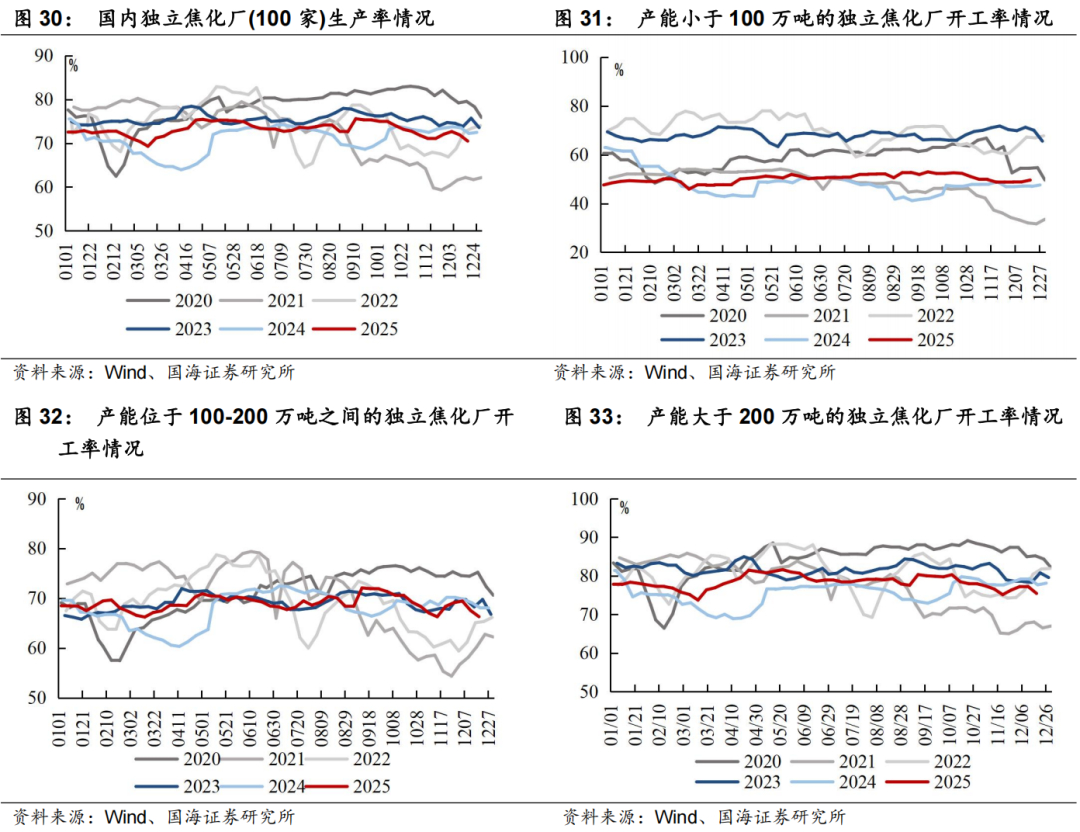 本周焦化厂生产率环比分化:截至12月19日,国内独立焦化厂(100家)焦炉生产率70.48%,周环比下降1.4个pct,产能小于100万吨的焦化企业(100家)开工率49.59%,环比上涨0.7个pct,产能在100-200万吨的焦化企业(100家)开工率66.29%,环比下降1.2个pct,产能大于200万吨的焦化企业(100家)开工率75.46%,环比下降1.8个pct。