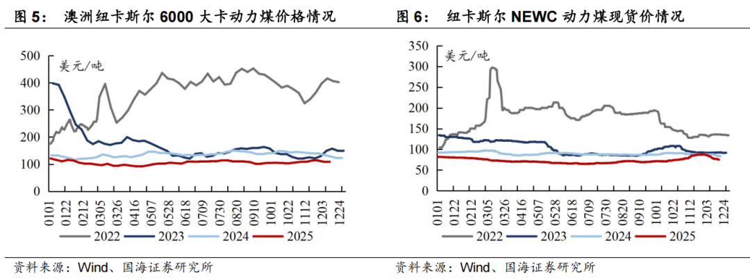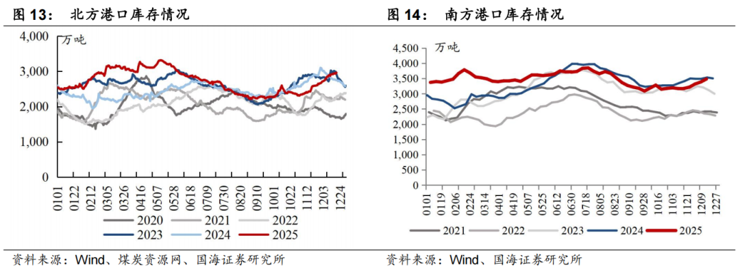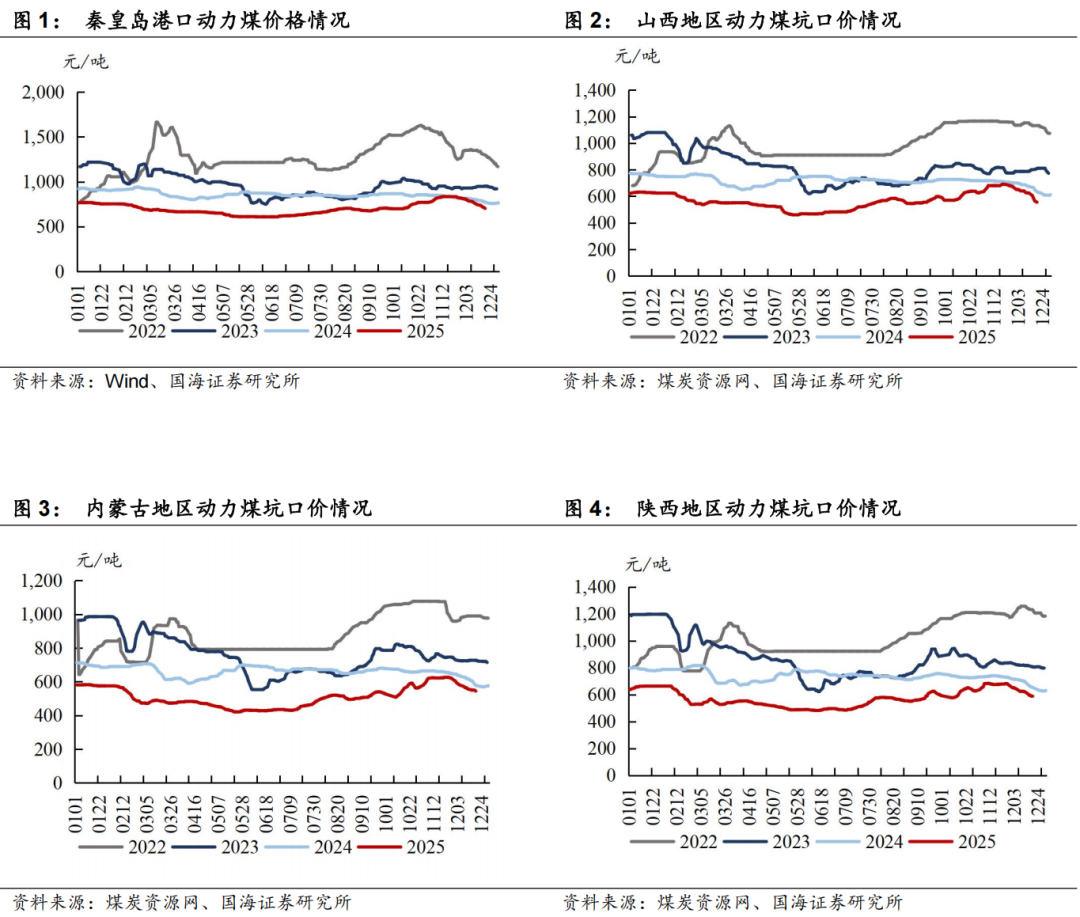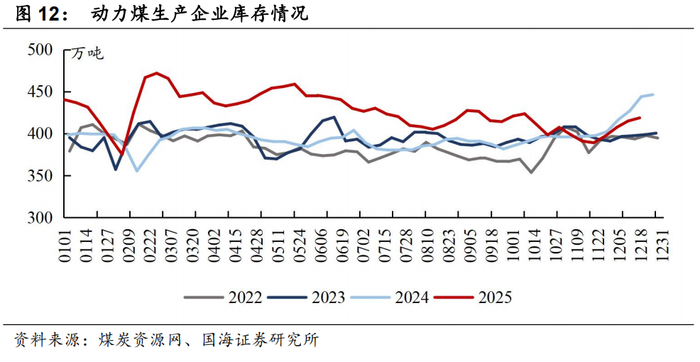 近期动力煤市场小结及展望:12月19日北方港口动力煤703元/吨(周环比下降42元/吨)。具体来看,(1)生产端,截至12月17日,三西地区样本煤矿产能利用率环比降低1.94pct,主要系部分矿井完成年度生产任务而停产减产所致。(2)运输端,本周市场发运环比分化,大秦线日均发运量周环比减少12.61万吨,呼铁局日均批车数周环比增加2列。(3)进口煤方面,印尼降雨影响开采之下供应略紧,并有部分空单回补需求,价格跌幅收窄,进口性价比收窄。另外,印尼政府计划自2026年起实施税率1-5%的煤炭出口税,预计将推高到货成本从而削弱印尼低卡煤价格优势。(4)需求端,本周六大电厂日耗周环比下降0.6万吨。(5)电厂库存方面,12月19日六大电厂库存1374.6万吨,较去年同期下降23.7万吨。(6)非电需求端,本周非电行业维持刚需采购,化工耗煤本周环比上升0.35%,铁水产量本周环比下降2.65万吨至226.49万吨。水泥开工率截至12月11日环比上升0.08pct。(7)港口端,本周北方港口库存环比提升63.20万吨。整体来看,受部分矿井完成年度生产任务停减产影响,本周生产收紧。但需求端,下游电厂日耗爬升速度一般,贸易商采购积极性受港口煤价下跌影响较弱,使得本周港口库存环比继续增加,叠加坑口成本支撑转弱,本周港口煤价环比下跌42元/吨至703元/吨。后续来看,供给端,年末生产仍有减量,需求端,今年春节较晚,后续气温仍有下降空间。同时,近期随着价格调整较多,坑口挺价意愿增强,煤价有望逐步止跌企稳。关注后续天气降温、坑口价格与港口库存情况。
