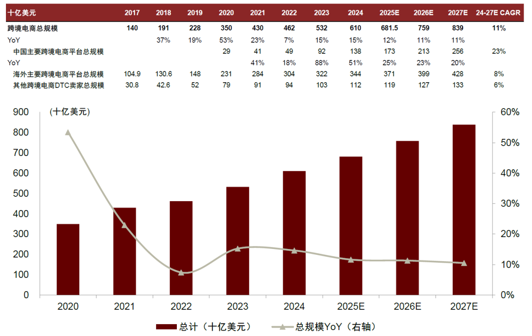 从结构看,在国内电商增长放缓的背景下,出海电商贡献的增量逐渐增加。我们测算25年出海电商占国内电商增长规模的比例为17%,到27年有望提升至25%,以净成交GMV计出海电商增量占国内电商增量的比例或更高。往中长期看,我们认为是否具备全球化能力,或成为电商平台收入与利润增长差异化的重要分水岭。