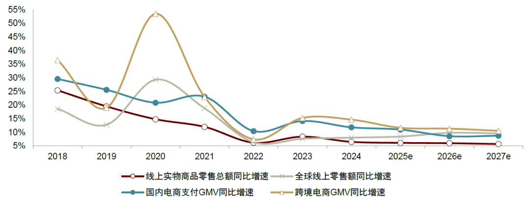 欧洲电商市场规模庞大但结构分散,欧洲最大的电商平台亚马逊也仅在英、德、法等核心市场保持领先地位,中欧、东欧等区域都有较强本土平台。2019–2024年欧洲电商GMV年均复合增速约13%,我们预计2024–2027年欧洲电商GMV有望保持约8%的增长。