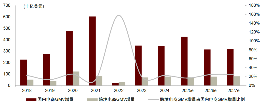 图表:国内电商GMV增量和跨境电商GMV增量对比