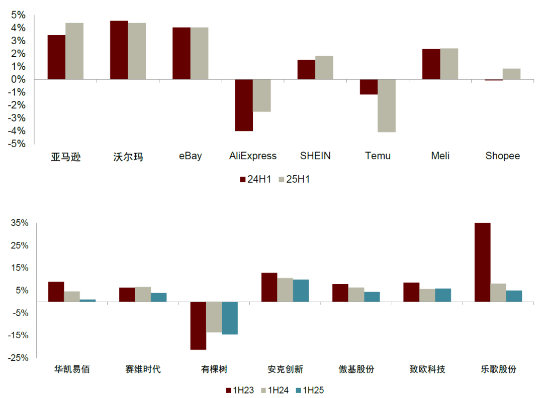 注:1)全球电商GMV为支付口径,除eBay使用non-GAAP、Shopee使用调整EBITDA外,电商EBIT为GAAP口径;2)AE为24/25财年调整EBITA/GMV;3)沃尔玛为EBIT/收入;4)傲基股份23年、24年为年度营业利润率