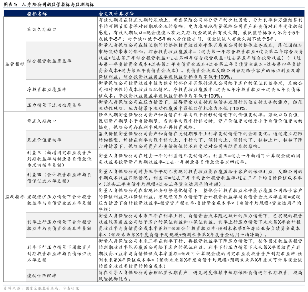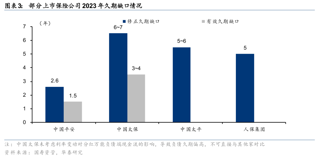 上市公司或满足久期缺口要求,中小公司或面临一定压力。《意见稿》要求人身险公司有效久期缺口不高于5年或低于-5年。从行业情况看,2023年久期缺口约为6年,其中,中小公司可能缺口相对较大。2023年中国保险资管业协会曹德云在2023年中国财富论坛指出,目前寿险负债端久期约12年,资产端久期约6年,资产负债久期缺口约为6年。从上市保险公司情况看,根据2024年国寿资管发布的《境内上市险企资负管理的观察与启示》,2023年中国平安和中国太保有效久期缺口分别约为1.5年、3~4年,符合监管要求。近年上市保险公司积极管控资产负债久期缺口,我们估计基本满足有效久期缺口5年以下的要求。