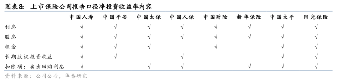 上市公司的投资收益指标计算各不相同,比如净投资收益,有的公司包括了长期股权投资收益,有的则不包括。我们对投资收益率的计算做了统一调整,尽可能使得各家公司的数据可比。我们所作的调整包括: