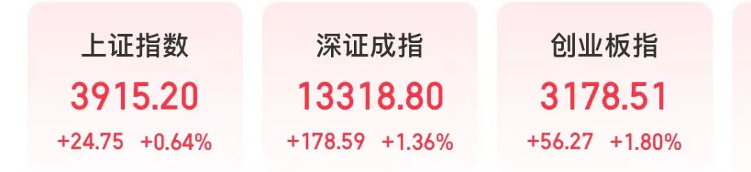 截至上午收盘,上证指数涨0.64%,深证成指涨1.36%,创业板指涨1.8%。