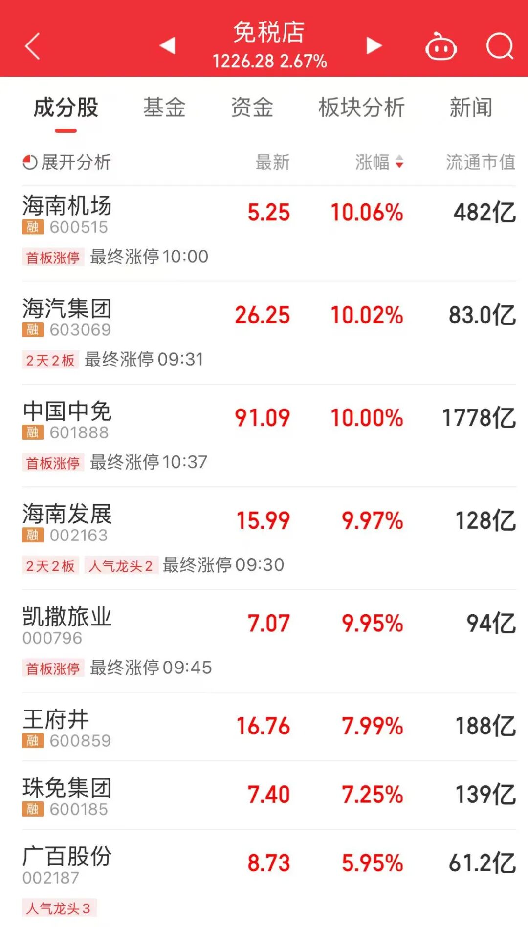今天上午,免税店板块上涨,龙头股中国中免涨停。