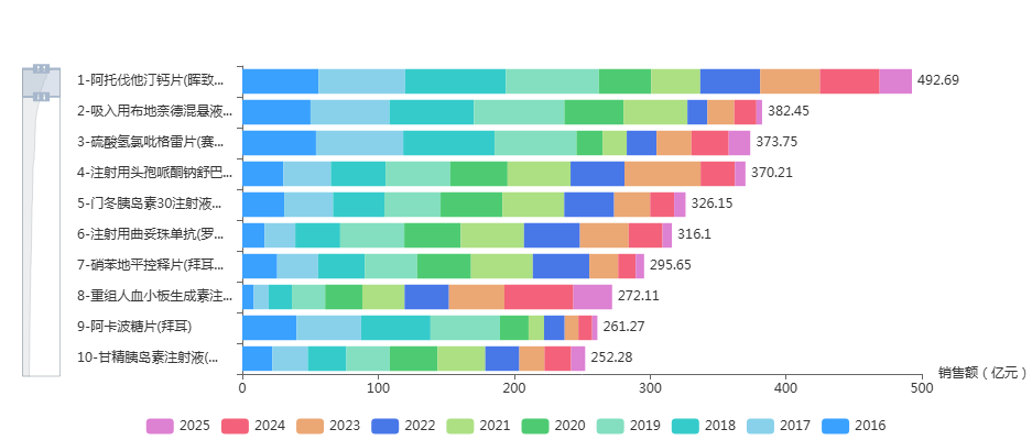 从时间维度看,2020年和2021年是中国医药市场的重要分水岭。2016-2019年,市场整体稳步增长,前十品种累计销售额在2019年达到477亿元的峰值;2020年受带量采购等政策影响,降至353亿元。政策全面推行与新药迭代,直接重塑了多个品种的市场命运。