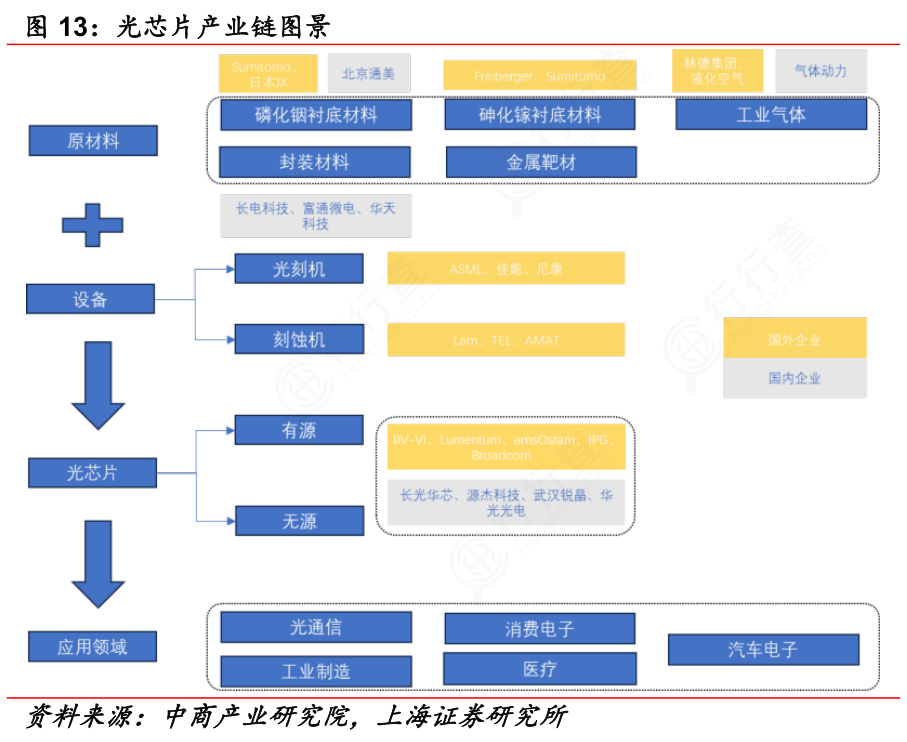 下游对应的是应用领域环节,涵盖光通信、消费电子、汽车电子、工业制造、医疗等多个方向,这些场景是光芯片产品的终端应用载体,也构成了推动光芯片行业发展的需求端支撑。