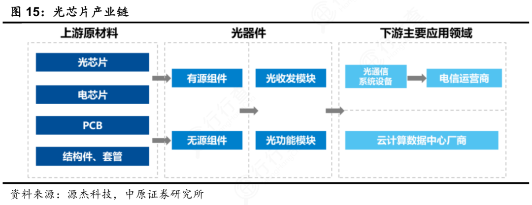 产业链的中游是光芯片环节,这是产业链的核心部分,主要分为有源与无源两类产品,承担着将上游的原材料与设备转化为光芯片成品的关键职能,是连接上游供应与下游应用的中间枢纽。