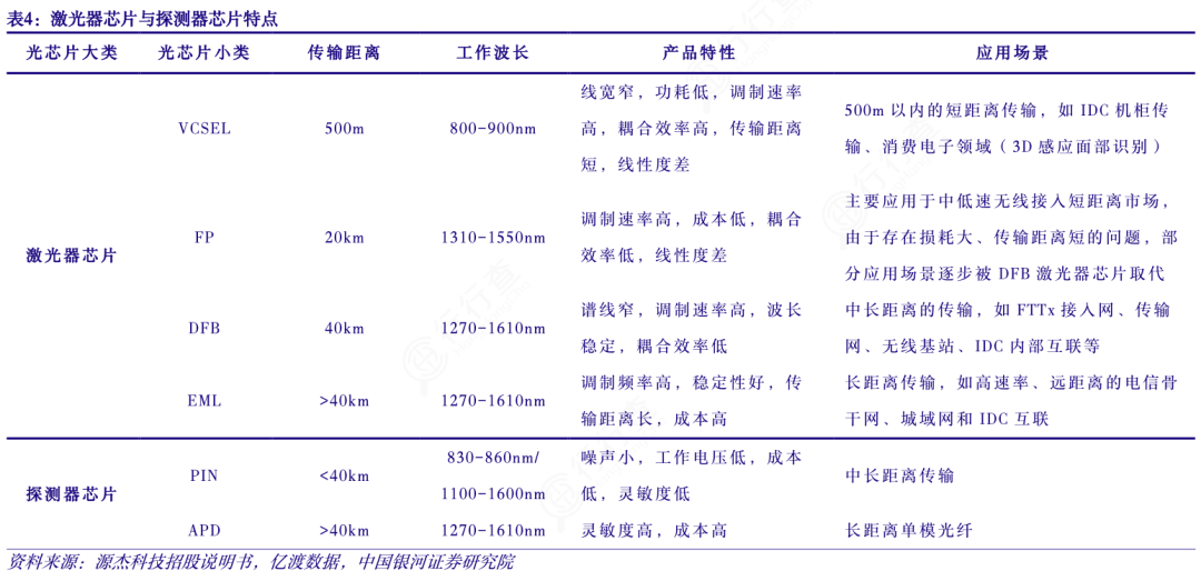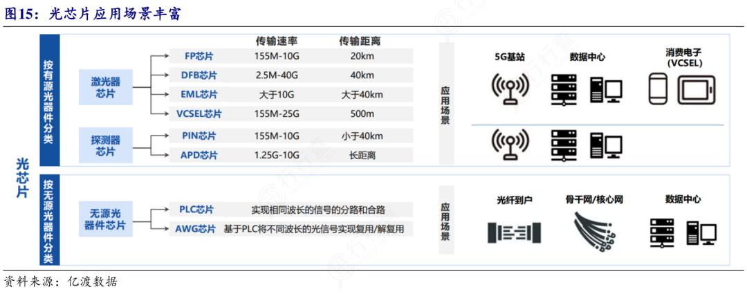 有源器件负责光信号产生与探测,核心为DFB、EML、VCSEL等激光器芯片及PIN、APD等探测器芯片;无源器件负责光信号传输与调控,包括光波导、耦合器、滤波器等,是片上光信号处理的基础。