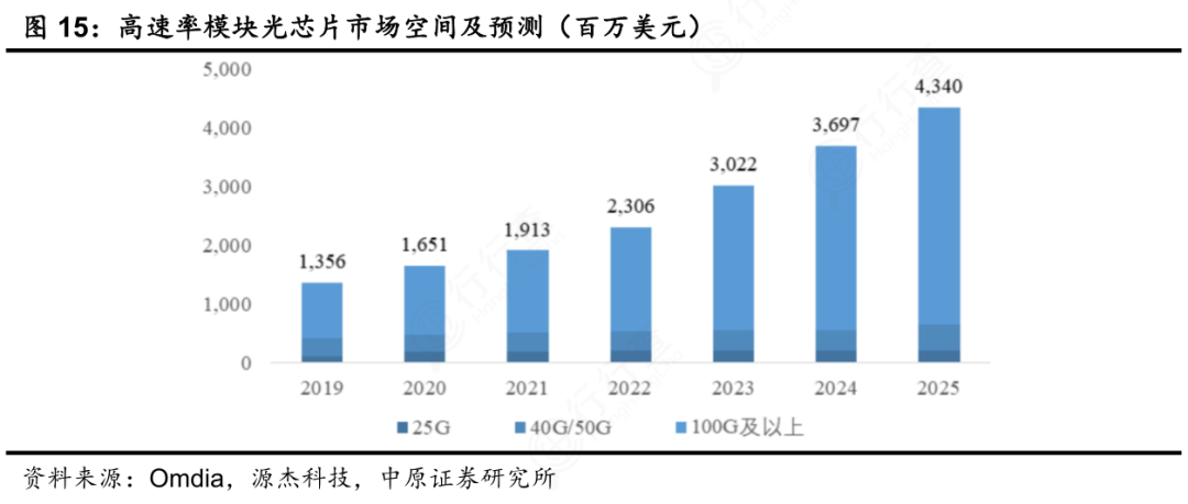 Omdia数据显示,从2019年到2025年,全球高速率模块光芯片市场规模由13.56亿美元逐步攀升至43.40亿美元,预计100G及以上高速率光芯片将成为推动市场增长的核心动力,其占比逐年提升。