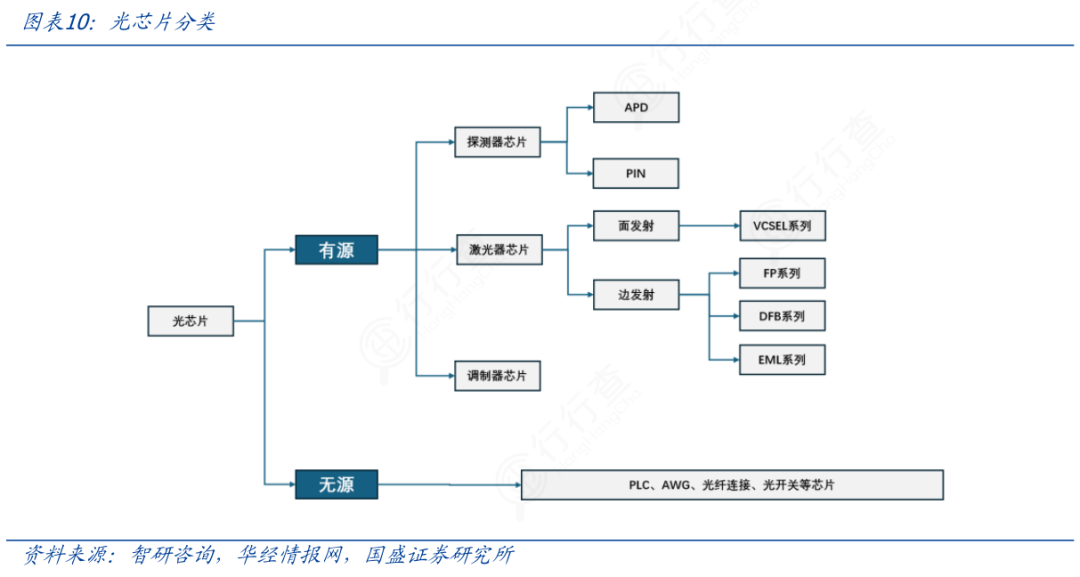 有源光芯片包括探测器芯片、激光器芯片和调制器芯片,其中探测器芯片又细分为APD和PIN两种类型;激光器芯片则根据发射方式不同,分为面发射和边发射两类。无源光芯片则涉及PLC、AWG、光纤连接和光开关等不同类型。