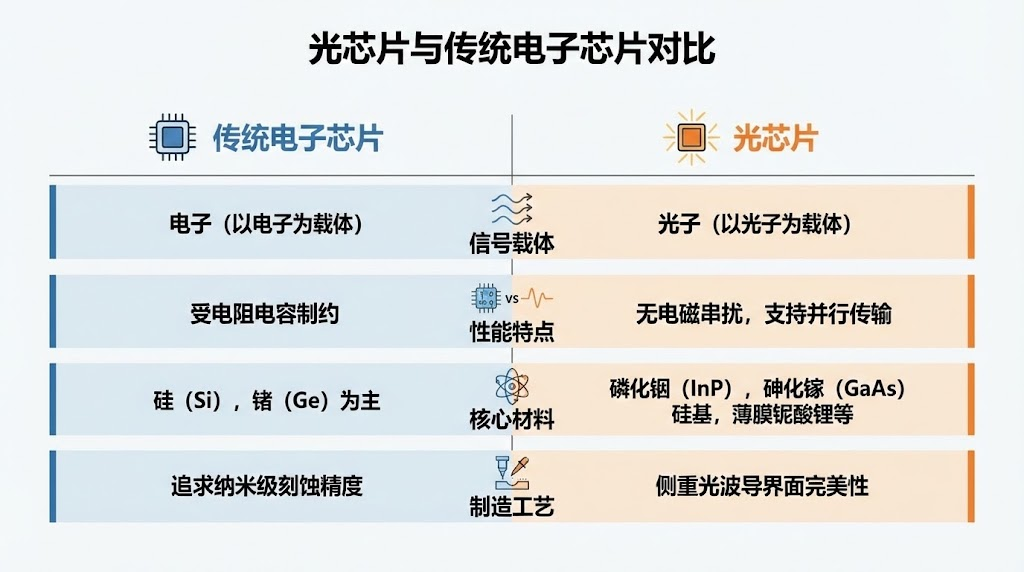 光芯片与传统电子芯片相比,差异源于信号载体的不同。电子芯片以电子为载体,受电阻电容制约,光芯片以光子为载体,无电磁串扰且支持并行传输。