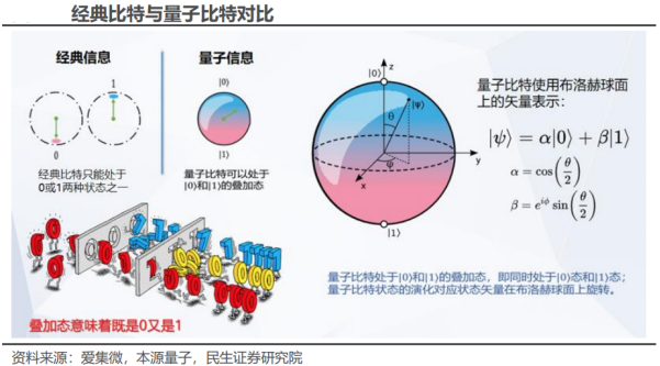 量子叠加:处于叠加态时,量子粒子是所有可能状态的组合,它们会不断波动,直到被观察和测量;以抛硬币为例,经典比特可以通过正面和反面来度量,而量子比特能够代表硬币的正反面以及正反交替时的每个状态;