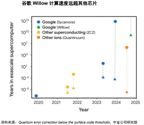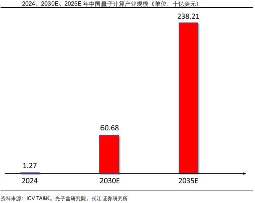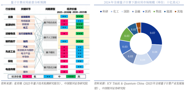 量子计算或将重塑现有的计算体系,成为未来算力体系的重要组成部分。算力作为数字时代重要的“底座”,将成为大数据、人工智能、移动互联网、云计算等众多新技术发展的最重要的基础设施。现有经典计算机由计算机内的逻辑电路实现算法,其输入态和输出态都是经典信号,而量子计算机的输入态和输出态为一般的叠加态,对经典计算作了极大的扩充,量子计算机对每一个叠加分量实现的变换相当于一种经典计算,并且并行计算同时完成。同时,其量子力学的特性,如量子叠加和量子纠缠,有望解决经典计算机难以处理的问题,或将是现有计算体系的极大补充,并有望在未来成为主要计算体系之一。目前,混合算力平台已经通过深度融合经典计算资源和量子计算资源,实现了计算能力的提升。由于当前量子计算硬件尚未完全成熟,难以单纯依赖量子计算机进行复杂计算,而混合算力平台通过深度融合经典与量子计算资源,可以将任务划分为经典与量子两部分协同处理,既充分利用现有经典计算资源,又能在核心任务上发挥量子并行优势以大幅提升计算效率。同时,由于混合算力平台的灵活性和可扩展性,可以依托云计算技术实现按需分配资源,充分满足不同规模和复杂度的计算需求,有效降低量子计算使用门槛,使科研机构与商业公司均可根据自身需求灵活配置算力资源。未来,随着各国持续布局,量子计算的生态系统和产业基础能力将不断完善,应用探索持续深化,市场参与主体将呈现多元化的发展趋势。此外,量子计算将与经典计算、人工智能等其他技术加速融合,突破技术瓶颈。全球量子计算产业生态仍处于发展初期,正逐步从理论研究走向实际应用,规模化应用和产业化仍有待进一步推进。上游企业提供支撑配套和服务功能,中游企业发挥创新决策主体、投入主体、科研组织主体、成果转化主体等作用,下游企业则助力推进应用示范牵引。未来各国将继续加大生态系统和产业基础能力的培育力度,鼓励量子计算上中下游企业共同参与、共建共担共享,在技术攻关、实验验证、应用探索等方面加强合作,打造产业可持续发展的新模式,共同构建企业紧密协作、融通发展的产业应用生态。量子计算将与其他技术加速融合,突破技术瓶颈。量子算力将与经典计算资源(通算、超算、智算)走向深度融合,形成“异构融合”体系,即量通融合、量超融合、量智融合,构建出一个多层次、适应性强的异构算力生态系统。同时量子与人工智能的结合将突破计算与智能的简单叠加,量子计算将在实际特定任务中为人工智能带来能力增强。全球主要经济体围绕量子计算展开了激烈的角逐,谷歌、微软、IBM、亚马逊等科技巨头积极布局,同时还涌现了大量的初创企业。可以预见,未来随着量子计算不断突破,应用潜能加速释放,市场参与主体将呈现多元化的发展趋势。除了当前活跃的大型科技企业和初创公司外,电信运营商、传统半导体制造企业等更多类型的主体将涌入这一前沿科技领域。未来,随着量子计算机硬件的迭代升级将带动软件与算法的发展,量子计算云平台的日益完善也将带动金融、医药、化工、AI等领域,以更低成本探索量子计算在其中的应用,推动量子计算在具体的实际问题上发挥作用,为不同行业带来颠覆性的创新。金融业或将成为量子计算应用领域的先锋。量子科技企业与金融机构在“量子计算 金融”的创新合作将持续深化。3、随着产业商业化应用逐步落地,量子计算未来市场空间广阔随着量子计算实际的商业化应用逐步落地,量子计算未来市场规模有望快速达到百亿美元规模。当前时点,随着谷歌的Willow芯片在量子纠错领域的突破,量子计算产业发展在一定程度上较预期更为乐观。同时,随着量子计算技术的不断突破,以及AI等新技术的快速发展,量子计算的应用边界被不断拓展,从而使量子计算的商业潜力更加广泛和深远。2024年,全球量子计算产业规模达到50.37亿美元,2024至2030年的年平均增长率(CAGR)有望达到87.64%。2027年,专用量子计算机预计将实现性能突破,带动整体产业规模达到111.75亿美元。我国量子计算产业规模有望持续快速上升。随着超导量子、光量子技术的不断突破,我国量子计算原型机也有望从实验室走向应用,从而加速我国量子计算产业发展。2025年,我国量子计算产业规模预计将达到115.6亿元,并保持30%以上的增长率。同时,量子计算在量子科技总体产业规模中占据41.2%的份额。08