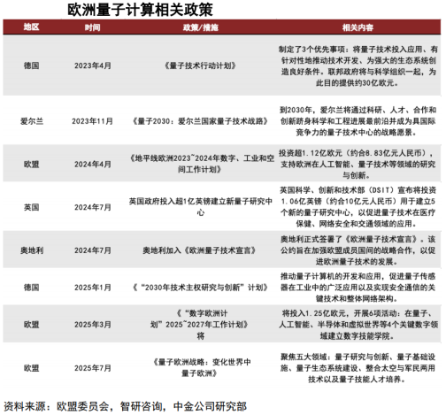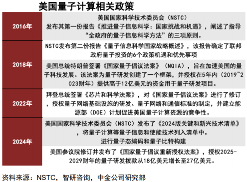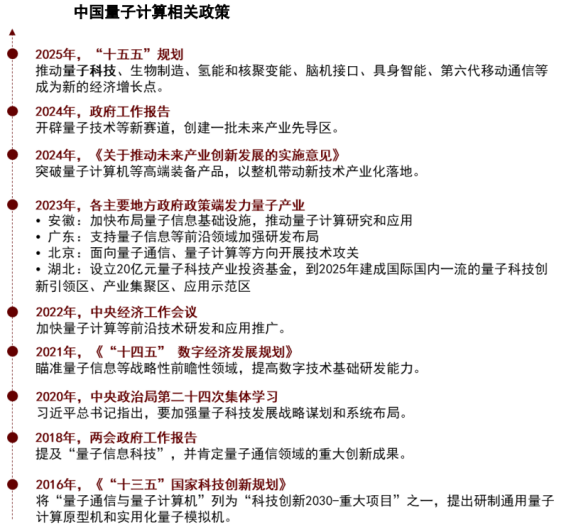 目前,全球主要经济体普遍将量子信息技术的发展上升至国家战略层面,欧洲、美国政府不断加大对量子计算产业的支持力度。自2016年以来,美国陆续发布多项利好政策推动量子科技创新,并持续扩大财政投入。2024年,美国国会预算办公室(CBO)修订并发布了《国家量子倡议重新授权法案》,授权2025-2029财年量子科技拨款额度由18亿美元上调至27亿美元( 50%),以强化其在全球量子竞争的领先地位。自上世纪90年代起,欧洲国家持续关注并推进量子计算发展,英、德、法等国相继出台量子战略与科研计划,带动量子科技产业体系化布局。欧盟层面则通过标准化与协同机制强化资源整合,助力提升欧洲整体竞争力。2、中国政策:从科研突破到产业落地,量子技术步入体系化发展阶段伴随全球量子计算热潮兴起,中国政府近年来持续加大对量子科技的战略投入。中国量子信息产业政策的演进大致分为三个阶段。早期以技术研发为重点,2016年的《“十三五”国家科技创新规划》和2021年的《“十四五”数字经济发展规划》等政策均将量子科技列为战略前沿领域;中期阶段开始强调成果转化与应用示范,2022年中央经济工作会议提出要加快量子计算应用推广,标志着量子技术进入实用化探索期;目前,政策重心进一步转向产业生态建设与商业化落地,引领量子技术从科研突破走向经济赋能。近日,中共中央关于制定国民经济和社会发展第十五个五年规划的建议发布。其中指出,前瞻布局未来产业,探索多元技术路线、典型应用场景、可行商业模式、市场监管规则,推动量子科技等成为新的经济增长点。与此同时,自2018年以来,美国就持续强化对量子科技的出口与投资管控。2024年9月美国商务部工业和安全局(BIS)发布《临时最终规则(IFR)》,针对量子计算实施新的出口管制,进一步扩大限制范围,将稀释制冷机、低温电路及相关软件纳入出口限制清单,并禁止美国资本投资中国量子计算企业;中国科学院、合肥国家实验室及中科大等机构被列入“实体清单”。在外部技术封锁加剧的情况下,我国正加快推进核心设备国产替代,稳步提升在全球量子计算竞争格局中的核心地位。04