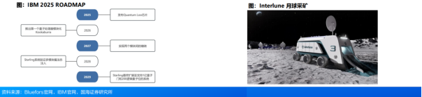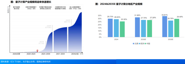 截至2025年8月,全球主要科技强国均将量子计算视为战略制高点,且近年来投入力度不断加大。2025年9月23日,美国白宫管理与预算办公室(OMB)与科技政策办公室(OSTP)联合向各联邦部门与机构发布《2027财年政府研发预算优先事项及跨领域行动》备忘录,将人工智能与量子信息科学与技术置于2027年研发预算优先级首位。白宫备忘录指出,量子科技正处于从实验室走向产业化应用的关键拐点。2、量子技术进口受到限制,我国量子计算产业必须自立自强量子技术进口受到限制,我国量子计算产业必须自立自强。欧美及日本等发达国家均已经在近两年发布对量子技术的限制措施,我国量子计算关键零部件/设备受阻。以量子计算核心设备稀释制冷机为例,自2022年美国宣布禁止对中国出口系列用于量子计算的稀释制冷机及其相关零配件后,行业龙头Bluefors和Leiden Cryogenics公司设备已不对中国出售,我国量子计算产业必须自立自强。3、产业化不断推进,量子计算云平台不断接入&扩大投入产业化不断推进,巨头企业相继取得成果。自2007年D-WAVE研发首台量子退火机以优化特定问题, 量子硬件从实验室走向工程化以来,Intel、IBM、 Google、Microsoft等一系列巨头企业相继对量子 计算进行研发并取得一定成果。量子计算云平台不断接入&扩大投入,中美欧三足鼎立。云平台布局方面,中美欧数十余家云服务商通过自主研发的量子计算机或基于经典计算资源的量子模拟器以及集成外部量子系统的方式向用户量子计算接入与算力服务,用以满足不同用户的需求。扩大投入方面,以微软为例,公司2025FY Q4云收入467亿美元,YOY 27%,公司在业绩会上宣布量子计算将成为云技术的下一个大型加速器,会继续以十年为周期进行战略思考和投资布局。4、产业化不断推进,2027-2029年或为关键节点据IBM量子计算Roadmap,预计2029实现大规模容错量子计算机。据IBM官网(2025/6),公司计划在2025年推出一款量子芯片——Quantum Loon,其具有更强连接能力和相应架构;预计于2026年推出第一个量子处理器模块化Kookaburra,将容错系统扩展到单个芯片之外;预计于2027年实现两个Kookaburra模块间的缠绕,从而像连接大型系统中的节点一样将量子芯片连接在一起;预计于2028年,Starling系统将验证多模块魔法态注入。最终预计于2029年,将Starling扩展至支持1亿量子门和200逻辑量子位的系统,成为全球首个大规模容错量子计算机。Bluefors签署历史最大氦-3采购协议:2025年9月16日,稀释制冷机龙头企业Bluefors在其官网上宣布与Interlune达成采购协议,据特气快讯公众号,协议规定Interlune将在2028年至2037年期间每年向Bluefors提供10,000升氦-3。氦-3可提供低于10毫开尔文的超低温,是稀释制冷机实现制冷的关键原材料。按中科富海公众号统计,稀释制冷机单位设备对氦-3年需求为20-100L,则该采购协议预计可支撑每年100-500台新设备需求。英伟达连续参投3家不同路线量子计算企业:英伟达于2025年9月4日、9月9日、9月10日,先后投资霍尼韦尔旗下Quantinuum、QuEra Computing、PsiQuantum,覆盖离子阱、中性原子、光量子三大路线。5、量子计算产业或将迎来第一轮快速增长,2024-2030年产业规模CAGR达87.66%量子计算产业或将迎来第一轮快速增长,2024-2030期间CAGR达87.66%。根据光子盒公众号,2024年全球量子计算产业规模为50.37亿美元,较2023年增长7.46%,预计2027年产业规模将达111.75亿美元,2030年将陡增到2199.78亿美元,后续在2034年之后进入第二轮增长。下游驱动方面,量子计算产业目前最大下游为科研领域,预计2035年量子计算主要受金融、化工、国防、医药等下游应用拉动。分地区来看,2024年北美为量子计算产业规模最大市场,占全球比重约在30%左右,并将持续领跑至2035年。中国2024年量子计算市场规模约12.7亿美元,占全球比重25.30%,预计2035年将达到2382.1亿美元,占全球比重29.49%。05