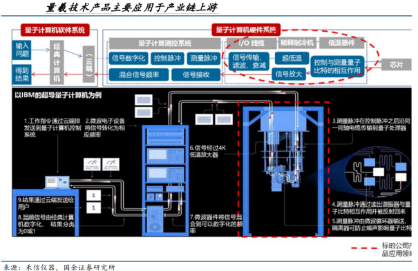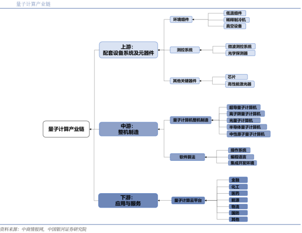 量子计算产业链上游是构建量子计算系统的基石,其核心价值在于为量子比特的稳定存在与精确操控提供必要的物理载体与环境支撑。当前,上游产业链主要包括极低温环境、精密测控系统与核心光子/芯片组件,其成熟度直接制约着中下游整机性能与规模化进程。国内外对比来看,欧美国家处于量子计算产业生态上游的企业数量更多且发展水平更高,在产品研制、技术创新以及市场需求等方面积累了较为优越的条件和资源。我国上游企业近几年发展迅速,相继推出各类自研产品,但在部分关键设备组件的性能指标、制造成本和市场认可度等方面仍有较大提升空间,国产替代是我国厂商的首要目标。在低温环境支撑层面,稀释制冷机作为超导等主流技术路线的核心基础设施,通过创造接近绝对零度的极低温环境(10mK区级)来维持量子比特的相干性。2022年欧美对华禁运后,国内产业链经历短期阵痛,但以中国电科16所、国盾量子为代表的企业已实现技术突破,其产品在温度、制冷量等关键指标上达到国际主流水平,初步完成国产替代。然而,在实现大冷量、高定制化目标上仍面临单组稀释单元性能提升与稀释制冷机中的“氦-3”进口依赖等挑战,技术迭代进入自主攻坚阶段。根据相关统计,2024年全球10mK区级稀释制冷机市场规模达3.54亿美元,其中,欧洲市场规模约1.47亿美元,北美市场规模约1.15亿美元,中国市场规模约0.58亿美元,其他地区市场规模约0.35亿美元。中国市场在经历2022-2023年供需失衡后,于2024年随产能释放快速恢复至近禁运前水平。在控制系统领域,量子计算测控系统作为量子计算的“神经中枢”,相当于经典计算机里的主机,是实现量子比特操控、读取和纠错的核心设备。比特数是衡量量子计算机可实现计算能力的重要指标之一,未来超导量子计算机一定是朝着大规模量子比特的路径发展的,但更核心的难点是提升每个比特的操控精度,只有操控精度和比特数同步提升,才能提升计算能力。该系统已形成固态体系(超导/半导体)与非固态体系(离子阱/中性原子)两大技术分支。在核心组件方面,激光器与感光元件构成了量子比特操控与读取的“感官系统”。其中,高稳定性、低噪声的窄线宽激光器成为离子阱与中性原子路线的关键。单光子探测器与电荷耦合器件等感光元件则持续向着更高探测效率、更低暗计数的方向演进。在硬件载体层面,量子计算芯片(QPU)与经典半导体芯片有部分类似之处,包括曝光、刻蚀、镀膜、封装等,这也是超导量子处理器可以快速规模化的原因。但量子计算芯片技术原理不同,需要通过印刷电感、电容和约瑟夫森结来构造量子比特。量子计算的核心任务是多量子比特的相干操纵--如何实现对每个量子比特的精确操控。量子芯片的设计正深度融入纠错逻辑,表面码、LDPC码等方案重构着芯片的拓扑结构与耦合网络。超导路线依托成熟的半导体工艺在芯片化进程中领先,其EDA工具链逐步完善;而半导体量子点与金刚石色心等路线仍受限于材料纯度与微纳加工精度,工程化进程相对滞后。芯片层级的创新已成为衡量各技术路线成熟度的重要标尺,也是未来竞争的核心战场。3、量子计算产业链中游是量子计算产业生态的核心环节量子计算产业链中游企业包括量子计算原型机制造商和软件供应商,是量子计算产业生态的核心环节,同时也是企业数最较为集中的部分。原型机方面,全球从事量子计算原型机研制的企业中专注于超导路线的企业数量最多,超过总量的三分之一,其次是离子阱、中性原子、光量子和硅半导体等技术路线。超导量子计算路线在2024年实现显著突破,其技术优势主要体现在三方面:量子处理器在门保真度等关键指标持续提升,运算速度达到微秒量级,同时借助半导体工艺实现了较好的比特扩展性。这种与成熟半导体产业的天然兼容性,使其在工程化进程中较离子阱、光量子等路线展现出更明确的产业化路径。另外,软件层已形成覆盖量子计算全生命周期的工具链:量子EDA软件为芯片设计提供仿真平台;测控系统软件构成实时调控的“神经中枢”;编译软件则承担着将量子程序转化为硬件可执行指令的关键桥梁作用。国内外对比来看,大部分国家并行布局多种技术路线。欧美企业在数量、原型机研制能力、软件研发、开源社区建设等方面占据一定优势。中国的量子计算产业发展政策不断完善,创新成果孵化有利条件增多,原型机及软件企业成长空间广阔。4、量子计算下游产业的核心价值在于实现量子算力的普惠化接入与行业应用转化量子计算下游产业的核心价值在于实现量子算力的普惠化接入与行业应用转化,当前产业链下游以量子云服务为核心载体,有效解决了量子计算机购置成本高昂、操作维护复杂的核心痛点。通过提供远程接入服务,云平台显著降低了科研机构与企业的使用门槛,构建起连接硬件资源与终端用户的关键桥梁,加速了算法验证与应用探索的迭代周期。此外,从应用市场结构来看,科研领域仍是现阶段量子算力的主要需求方,高校、国家实验室及科技巨头通过真机采购开展基础原理研究与算法开发。但随着技术成熟度的提升,应用重心正快速向商业化场景迁移。其中,根据ICV TA & K & Quantum China预计,金融行业凭借对计算效率的极致追求,在投资组合优化、风险建模等复杂金融问题上的应用潜力明