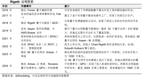 战略定位:谷歌的量子计算战略不受短期商业压力的影响,其目标非常明确和聚焦:构建一台大规模、可纠错、具备商业价值的量子计算机。该战略通过一个分为六个阶段的清晰路线图来推进,最终目标是在本十年末(约2029年)建成一台拥有一百万个物理量子比特的系统。技术进展:谷歌为其量子计算项目制定了一个清晰的六步走路线图,旨在从当前的NISQ设备发展到未来的大规模容错量子计算机。里程碑1:超越经典(2019年实现):通过其Sycamore处理器实现“量子优越性”,在200秒内完成了一项当时最强大的超级计算机需要1万年才能完成的特定计算,标志着量子计算首次进入NISQ时代。里程碑2:量子纠错(2023年实现):首次演示了逻辑量子比特子型,证明通过“量子纠错”(quantum error correction)方案增加量子比特数量,能够降低误差。里程碑3:构建长寿命的逻辑量子比特:这是一个未来的工程目标,旨在创建一个能够执行一百万次计算步骤而出错次数少于一次的逻辑量子比特。这需要对量子比特性能、架构和纠错技术进行全面提升。里程碑4:创建逻辑门:在拥有稳定的逻辑量子比特之后,下一步是实现它们之间的可控交互。该里程碑的目标是演示在逻辑量子比特之间执行的低错误率量子门操作。里程碑5:工程化扩展:此阶段的目标是将系统扩展到100个逻辑量子比特,并使它们能够协同进行高保真度的门操作。谷歌预计,在这一阶段将能实现多个有实际价值的纠错量子计算应用。里程碑6:大规模纠错量子计算机:路线图的最终目标是构建一个包含一百万个物理量子比特的大规模纠错量子计算机。这台机器有望在医药、可持续技术等多个行业中释放量子计算的全部潜力。2、Rigetti Computing(NASDAQ:RGTI):超导路线的挑战者战略定位:Rigetti是一家全栈式量子计算公司,其独特之处在于拥有自己的量子芯片制造工厂(Fab-1),这使其能够快速迭代和控制其超导芯片的设计与生产。公司专注于一种模块化的多芯片处理器架构,旨在解决超导路线的扩展性挑战。技术进展:Rigetti的量子处理器是基于可调谐超导传输子(transmon)量子比特的通用门模型量子计算机。这是量子计算领域的主流技术路线之一,与IBM和谷歌等巨头采用的技术类似,能够利用成熟的半导体制造工艺。量子比特的核心部件是约瑟夫森结(Josephson Junction,JJ)。公司的处理器架构经历了多次迭代,从早期的少量量子比特芯片,发展到Aspen系列,再到如今的第四代Ankaa架构。Ankaa系列芯片(如84量子比特的Ankaa-1、Ankaa-2和82量子比特的Ankaa-3)采用了可平铺的多芯片设计,具有方形晶格拓扑和四重连接性。该架构通过可调谐耦合器来中介更快、性能更高的双量子比特门(如ISWAP门),旨在实现更高的可扩展性。与前几代相比,Ankaa架构在读出保真度、门执行速度和串扰抑制等方面都有显著提升。优势:公司拥有全球首个专用量子芯片制造工厂Fab-1,可自主完成量子芯片的设计、制造、测试全流程,大幅缩短研发周期(芯片开发周期仅5-15周,远低于传统半导体的22-40周),同时规避外部供应链风险。截至2025年8月,Fab1已积累48项专利(含21项已授权),覆盖多芯片处理器、封装等关键技术,形成技术壁垒。国盾量子技术起源于中国科学技术大学,并引入中国电信全资子公司中电信量子为战略投资者,专业从事量子通信、量子计算、量子精密测量产品的研发、生产和销售,并提供相关技术服务,是A股市场唯一一家以量子技术为主营业务的上市企业。在量子通信领域,公司市场份额占比达90%,是国内量子通信领域的绝对龙头,为各类光纤量子保密通信网络以及“星地一体”广域量子保密通信网提供软硬件产品,以及为政务、金融、电力等各行业和领域的客户提供量子安全应用解决方案;在量子计算领域,公司参与“祖冲之号”超导量子计算研发,推出稀释制冷机ez-Q Fridge,可提供176比特超导量子计算整机,并已通过量子计算云平台对外开放;在量子精密测量领域,公司已交付“飞秒激光频率梳”“冷原子重力仪”等产品,加速规模化商用进程。得益于量子通信产品及解决方案的市场需求提升,25Q1公司营业收入同比增长106.03%,归母净利润-0.20亿元,亏损同比收窄51.04%。同时,公司量子业务布局持续拓展,已从量子通信单一领域延伸至量子计算及量子精密测量等多元化方向,规模化效应逐步显现。禾信仪器专注于质谱仪的自主研发、国产化及产业化,是国内质谱仪领域从事自主研发的少数企业之一。受宏观经济因素影响,公司营收规模持续下滑,25Q1营收同比-32%,但毛利趋于稳定,未来有望借助创新业务场景和跨赛道并购,迎来业绩增长拐点。量子计算将成为公司重要增长极。24年10月,公司通过发行股份与现金支付,拟对上海量羲技术有限公司实施战略收购,现已通过股东大会。量羲技术长期深耕于极低温环境下极微弱信号测量调控设备的研发、生产与销售,其自主研发的设备广泛适配于超导量子计算、表面物理特性研究、拓扑超导现象探索等前沿领域,可以为超导量子计算芯片提供极低温、低噪音、低干扰的极端环境条件,客户群体覆盖国内头部高校、国家级科研院所及高新技术企业。若收购达成,禾信仪器有望依托双方技术与市场优势,在量子计算产业链中实现资源整合与技术协同,为公司开辟新的业绩增长点。2024年,受益于量子计算产业的快速发展和中标项目的大幅增加,量羲