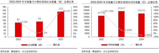 量子纠缠:纠缠是量子粒子将其测量结果相互关联的能力,当量子比特相互纠缠时,它们构成一个系统并相互影响,人们可以使用一个量子比特的度量来作出关于其他量子比特的结论,通过在系统中添加和纠缠更多的量子比特,量子计算机可计算指数级的更多信息并解决更复杂的问题;量子干扰:量子干扰是量子比特固有的行为,由于叠加而影响其坍缩方式的可能性,量子计算机旨在尽可能减少干扰,确保提供最准确的结果。与传统计算相比,量子计算能够带来更强的并行计算能力和更低的能耗。据赛迪智库,量子计算通过量子态的受控演化实现数据的存储计算,可以分为数据输入、初态制备、量子逻辑门操作、量子测算和数据输出等步骤,其中量子逻辑门操作是一个幺正变换,这是一个可以人为控制的量子物理演化过程;经典计算机的运算模式为逐步计算,一次运算只能处理一次计算任务,而量子计算为并行计算,可以同时对2^n个数进行数学运算,相当于经典计算重复实施2^n次操作;同时,传统芯片的特征尺寸很小(数纳米)时,量子隧穿效应开始显著,电子受到的束缚减小,使得芯片功能降低、能耗提高,将不可逆操作改造为可逆操作才能提高芯片的集成度,量子计算中的幺正变换属于可逆操作,有利于提升芯片的集成度,进而降低信息处理过程中的能耗。量子计算的运算能力根据量子比特数量指数级增长,在AI领域具有较大潜力。在经典计算中,计算能力与晶体管数量成正比例线性关系,而量子计算机中算力将以量子比特的指数级规模增长,据中国计算机学会微信公众号,2012年“量子优势”(同样的计算任务,量子计算速度高于传统计算)的概念被提出,并在2019年由谷歌团队实现了实验验证,2020年,潘建伟院士团队基于高斯玻色采样模型成功构建了76个光子的量子计算原型机“九章”进一步验证了量子优势。量子计算机所能拥有的量子比特数由最初的2量子比特增长到了数百量子比特,并正以可观的速度继续增长,这为实现更可靠、更大规模的量子计算,以及挖掘基于量子计算的人工智能应用带来更多可能性。全球量子计算的硬件仍处于多种路线并行探索阶段,不同的技术路线基于对量子比特的不同物理实现方式展开。主流路线大致分为两类:一类是基于固态体系的“人造粒子“路线,如超导与硅半导体;另一类是基于原子体系的“天然粒子”路线,如离子阱、光量子与中性原子。各路线在稳定性、可扩展性和保真度等方面权衡取舍明显,目前尚无单一路线占据绝对主导地位。多线路协同探索正引领量子计算技术向“高稳定性—高保真度—可扩展性”方向演进,共同推动未来量子计算机从实验验证步入商业化应用。从发展进度来看,超导量子凭借高保真度、易扩展性及成熟的制程工艺在产业化道路上保持领先,全球有效授权专利量达10,888项,位居首位,发展前景最为稳健;离子阱路线具备很高的保真度,但可扩展性较差,有效授权专利量3,049项,整体发展略逊色于超导技术;中性原子路线近年来突破显著,展现出更强的可扩展性,但在提高保真度上仍面临技术挑战,有效授权专利量为1,313项,发展进度相对落后于前两者。量子计算已成为全球主要国家之间开展综合国力竞争,维护国家技术主权的关注焦点之一。有鉴于量子计算在算力性能上的颠覆性,量子计算机已经成为全球科技竞争的重要方向之一。截至目前,已有30余个国家开展了以量子计算为重点的量子信息领域规划布局,其中中美在量子计算领域处于第一梯队。当前,美国在量子计算领域居于领先地位。在量子计算产业的政策、技术、人才、产业孵化及融资等方面均具备强大的实力和优势。其核心在于目前美国拥有全球最活跃的量子创新生态系统,使得美国在国防、金融、医疗、制药等众多领域对量子技术这种新兴算力有着更为迫切的需求。我国在量子计算领域仍处于追赶者的地位,与美国相比,仍存在一定差距。由于中国的量子计算上游零部件曾在较长时期依赖进口,但中美关系的变化以及美国对华科技投资限制的不断强化,欧美对中国的禁运力度不断加大,对中国量子计算产业产生了较大的影响。目前,随着我国中国电科16所、量羲技术、知冷低温、中船鹏力超低温、中微达信、赋同量子、上海频准等企业打破了欧美的技术封锁,实现了国产替代。我国量子计算产业持续加速发展。当前,我国量子计算领域企业及专利数持续上升,验证我国量子计算产业高景气度。2024年,我国有153家量子计算企业,较2023年增长39.2%,呈明显增长态势。虽然由于目前量子计算仍处于产业初期,企业利润率仍为负值,但随着应用落地时点的逐步明确,企业整体盈利空间有望实现进一步扩大。同时,我国量子计算领域专利申请书已经连续三年(2022-2024年)突破一万件,产业创新活力凸显。相较于中美,欧洲在量子领域的整体实力存在一定差距,但目前已逐步加大投入力图追赶。随着美国在量子计算领域的迅速布局并取得优势,欧洲也开始大力发展量子计算产业,参与国家日益增多,整体展现出“众人拾柴火焰高”的趋势。欧盟委员会于2025年7月初正式推出《量子欧洲战略》(Quantum Europe Strategy),旨在通过一体化发展路径,提升欧洲在全球量子技术竞争中的话语权,抢占新一轮科技革命的制高点。同时,今年9月,英国和美国就《科技繁荣协议》达成一致,文件承诺