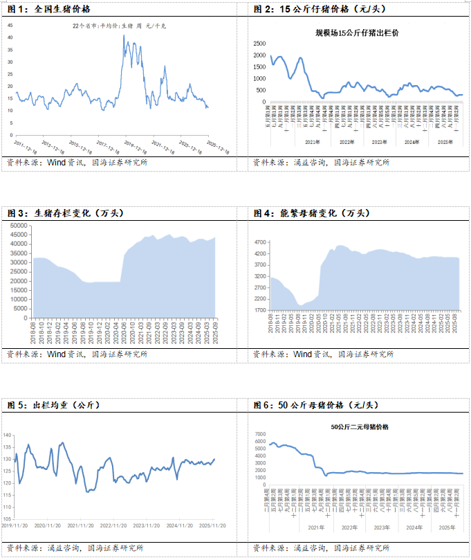 (2)据农业农村部,2025年十月末能繁殖母猪存栏3990万头,环比下降1.1%,同比下降2.1%。十月规模以上生猪定点屠宰企业屠宰量为3834万头,同比增加26.2%。