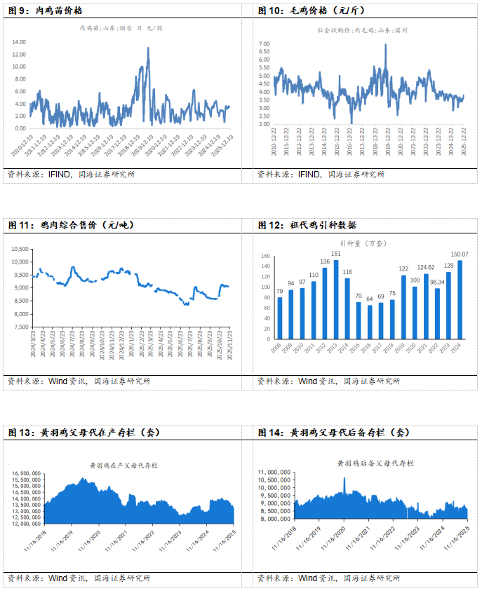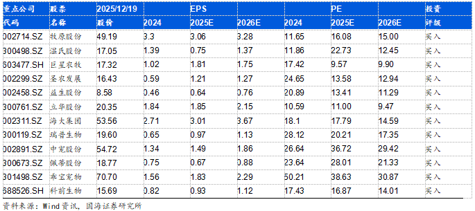 (3)观点: 禽板块基本面有望改善;①白羽鸡引种端:据中国畜牧业协会数据,2025年10月,祖代更新12.5万套,2025年1-10月累计祖代更新107.21万套。②价格及行业分析:2024年,祖代雏鸡更新150.07套。其中,进口占比45%,自繁占比55%。2025年1-10月,祖代雏鸡更新107.21万套,其中,进口占比45.6%,自繁占比54.4%。进口品种从法国引进,哈伯德、AA、罗斯祖代。从行业角度看,禽价格较为低迷,后续关注周期边际变化。我们持续推荐圣农发展、立华股份。
