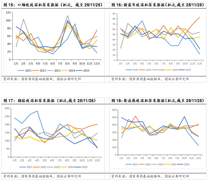(1)生猪养殖行业持续亏损已超3个月,预计猪价短期仍维持低位震荡趋势。由于动保行业景气度与下游养殖盈利存在一定的相关性,若四季度亏损持续将会对动保企业业绩产生不利影响,但头部动保企业依靠完善的业务布局以及大客户资源优势有望展现出更强的业绩韧性。
