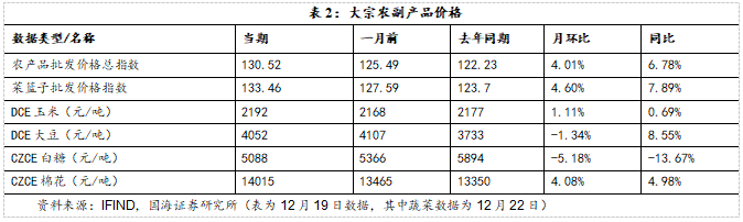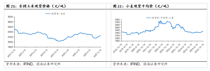 (1)玉米小麦价格周环比回升。2025年12月19日全国玉米现货价为2244元/吨,周环比 0.3%,月环比 2.9%,同比 9.9%;2025年12月19日全国小麦现货均价为2515元/吨,周环比持平,月环比 0.8%,同比 2.7%;2025年12月19日全国豆粕现货均价为3118元/吨,周环比-0.5%,月环比 1.5%,同比 9.1%;2025年12月19日全国猪粮比价为5.03。
