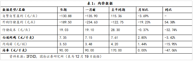 (1)11月22日白羽鸡父母代鸡苗,综合售价41元/套,周环比-6元/套;12月6日白羽鸡商品代鸡苗3.6元/只,周环比持平;毛鸡主产区价格3.6元/斤,周环比持平;鸡肉综合售价9166元/吨,周环比 53元/吨。