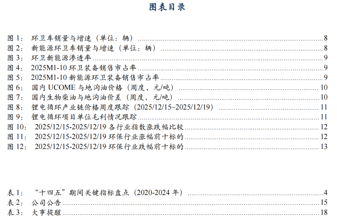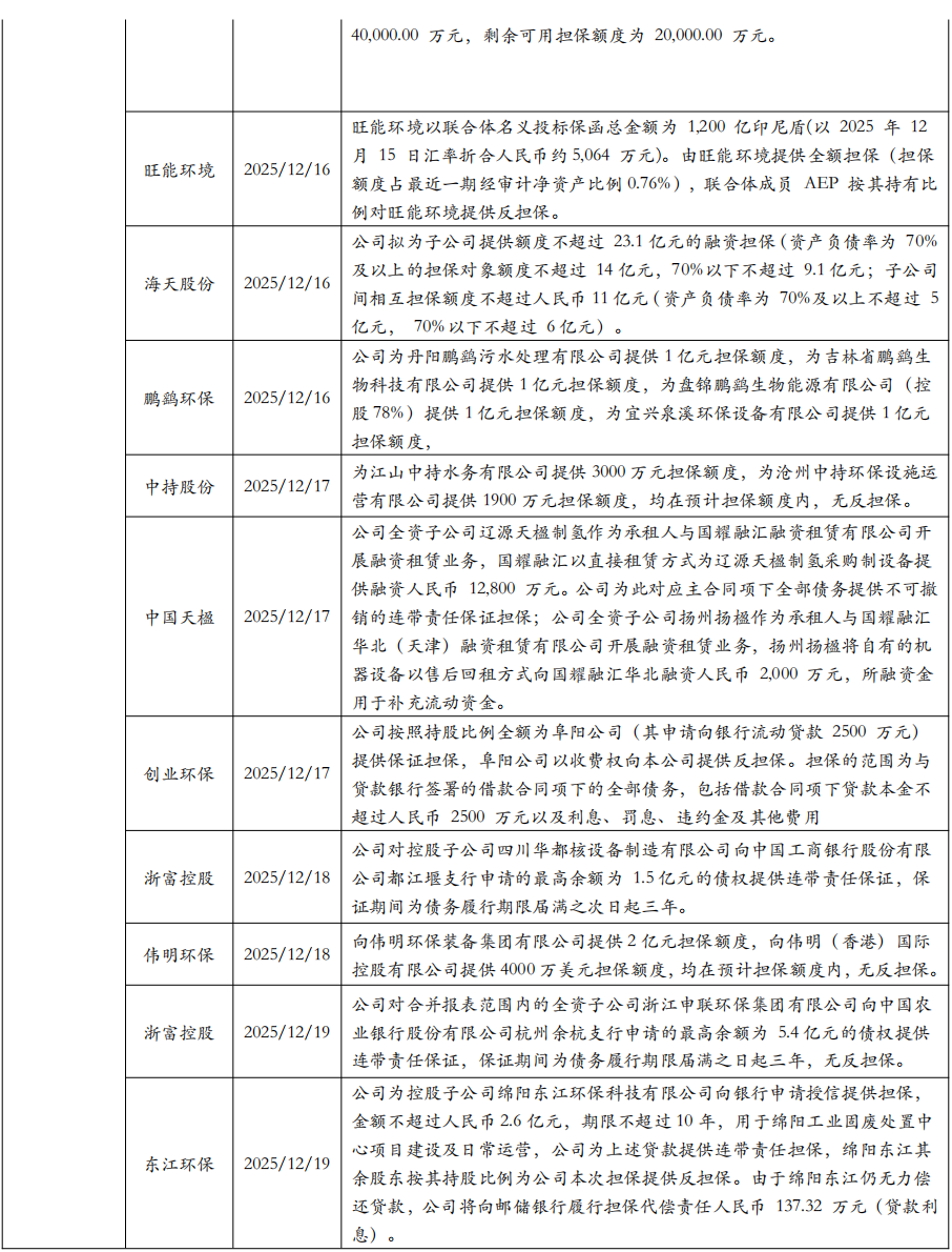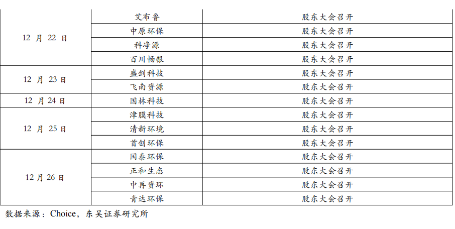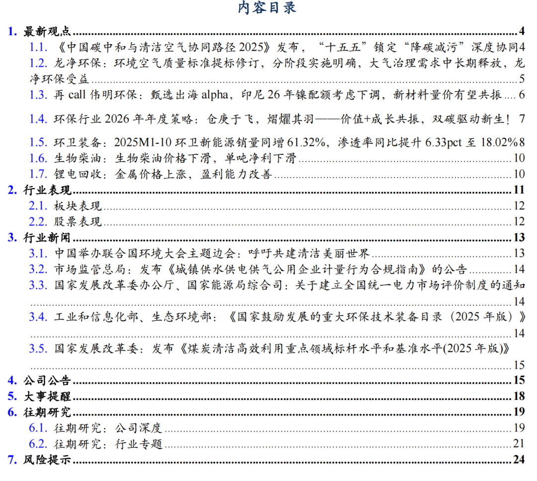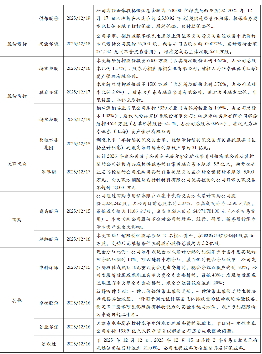 3. 行业新闻 3.1. 中国举办联合国环境大会主题边会:呼吁共建清洁美丽世界 3.2. 市场监管总局:发布《城镇供水供电供气公用企业计量行为合规指南》的公告 2025年12月9日,生态环境部发布《突发生态环境事件水污染物应急控制水平确定技术指南(试行)(征求意见稿)》,公开征求意见至2026年1月9日。该指南旨在完善环境应急控制标准体系,提升应急处置精准性与科学性。本标准的制定,进一步完善了环境应急类标准体系结构,填补了我国在环境应急处置技术、应急处置目标确定方法等方面的空白,实现在突发生态环境事件发生的情况下,完成突发生态环境事件下游水生态环境保护目标和特征污染物的识别、水生态环境保护目标污染物控制水平的确定、污染应急处置控制断面污染物控制水平的确定,并保证水污染物应急控制水平的实现具有技术经济可行性,为突发生态环境事件应急处置提供技术支撑。 数据来源:https://www.mee.gov.cn/xxgk2018/xxgk/xxgk06/202512/t20251209_1137426.html 3.3. 国家发展改革委办公厅、国家能源局综合司:关于建立全国统一电力市场评价制度的通知 两部门联合印发关于建立全国统一电力市场评价制度的通知,按照完善全国统一电力市场体系要求,围绕加快构建新型电力系统的总体目标,构建科学、系统、动态的电力市场评价体系,统筹安全保供、绿色转型、经济效率等多重目标,全面准确评价电力市场运行成效,为电力市场建设和监管提供决策依据,促进监管工作科学化、精准化,进一步发挥全国统一电力市场在电力资源优化配置中的决定性作用。通知提出,全国统一电力市场评价工作应结合市场建设情况开展多维度综合评价,重点围绕电力市场运营效果、市场作用发挥、经营主体可持续性发展、市场竞争充分度四个方面开展评价。 数据来源:https://www.ndrc.gov.cn/xxgk/zcfb/tz/202512/t20251217_1402475.html 3.4. 工业和信息化部、生态环境部:《国家鼓励发展的重大环保技术装备目录(2025年版)》 2025年12月18日,工业和信息化部、生态环境部联合印发《国家鼓励发展的重大环保技术装备目录(2025年版)》。目录包含开发类、应用类、推广类三大类别,覆盖大气污染防治、水污染防治、固体废物处理、土壤污染修复、环境监测、污染应急处理、减污降碳协同处置等核心领域,规定了关键技术及主要技术指标。 数据来源:https://huanbao.bjx.com.cn/news/20251218/1475398.shtml 3.5. 国家发展改革委:发布《煤炭清洁高效利用重点领域标杆水平和基准水平(2025年版)》 为推动煤炭产业由低端向高端、煤炭产品由初级燃料向高价值产品攀升,近日,国家发改委发布了《煤炭清洁高效利用重点领域标杆水平和基准水平(2025年版)》。 相对于2022年版的煤炭清洁高效利用重点领域标杆水平和基准水平指标,2025年版将燃煤发电供热煤耗、煤制天然气等纳入范围。并结合近3年来国家标准和相关政策制修订情况更新相关技术指标。通知提出,要分类实施改造升级,着力提升利用水平。充分利用现有政策工具和工作机制,加大煤炭清洁高效利用市场调节和督促落实力度,加快企业改造升级步伐,提升煤炭清洁高效利用整体水平。 数据来源:https://www.ndrc.gov.cn/xxgk/jd/jd/202512/t20251217_1402486.html 4. 公司公告 ![]() ![]() ![]() ![]() 5. 大事提醒