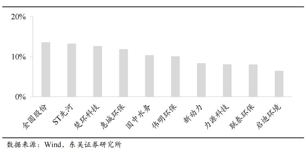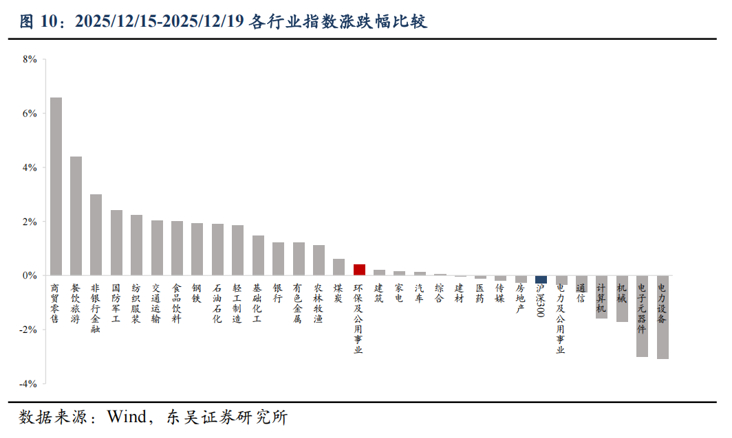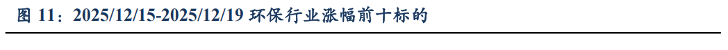 2. 行情表现 2.1. 板块表现 2025/12/15-2025/12/19本周环保及公用事业指数上涨0.4%,表现好于大盘。本周上证综指上涨0.03%,深证成指下跌0.89%,创业板指下跌2.26%,沪深300指数下跌0.28%,中信环保及公用事业指数上涨0.4%。 ![]() 2.2 股票表现 2025/12/15-2025/12/19本周涨幅前十标的为:金圆股份13.51%,ST先河13.17%,楚环科技12.57%,惠城环保11.81%,国中水务10.29%,伟明环保10.03%,新动力8.29%,力源科技8%,联泰环保7.96%,启迪环境6.39%。