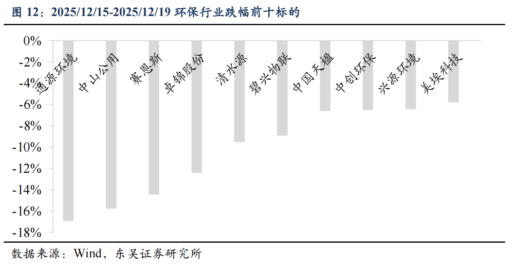 2025/12/15-2025/12/19本周跌幅前十标的为:通源环境-16.89%,中山公用-15.74%,赛恩斯-14.41%,卓锦股份-12.38%,清水源-9.5%,碧兴物联-8.88%,中国天楹-6.58%,中创环保-6.49%,兴源环境-6.41%,美埃科技-5.77%。