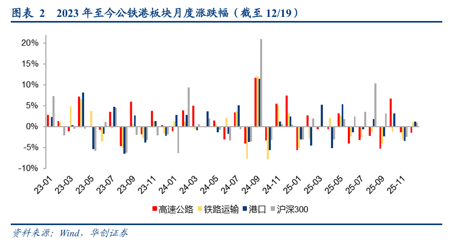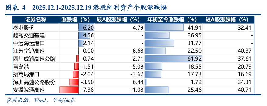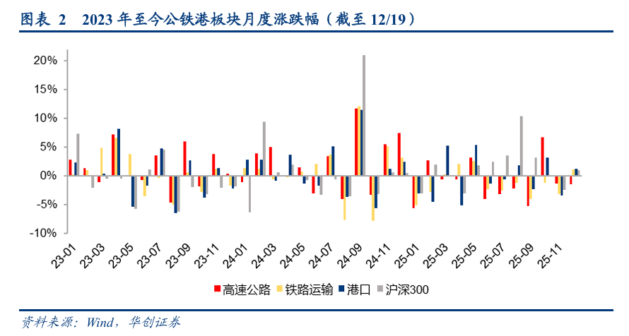 2025/12/1-12/19期间,高速公路、铁路运输、港口累计涨跌幅-1.45%、 1.12%、 1.21%,12月红利资产(公铁港)表现一般,铁路运输与港口跑赢沪深300指数,均跑输交运指数。