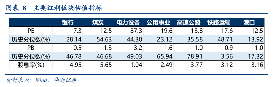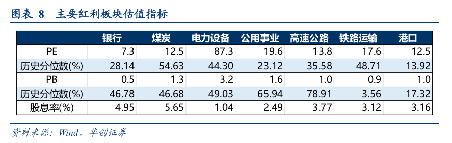 相较银行、煤炭、电力设备、公用事业,从PE历史分位数看,煤炭为主要红利资产细分行业中最高,港口为最低;PB历史分位数,高速公路为主要红利资产细分行业中最高,铁路运输为最低;从行业整体股息率看,高速公路、铁路运输与港口均在3%-4%区间内,煤炭和银行领先。