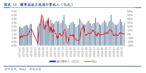 2025年11月,赣粤高速实现车辆通行服务收入3.09亿元,同比-0.2%。