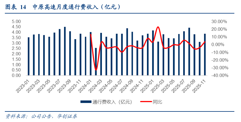 2025年11月,中原高速实现车辆通行服务收入3.87亿元,同比 3.79%。