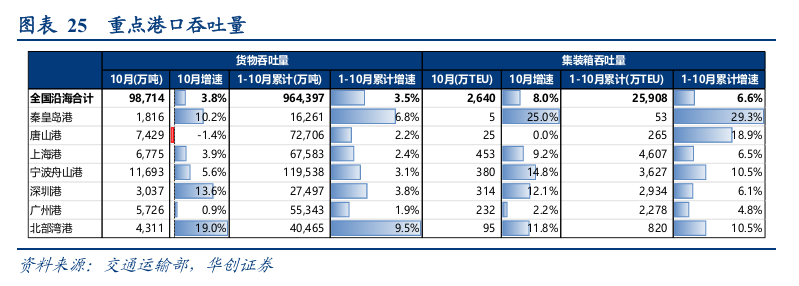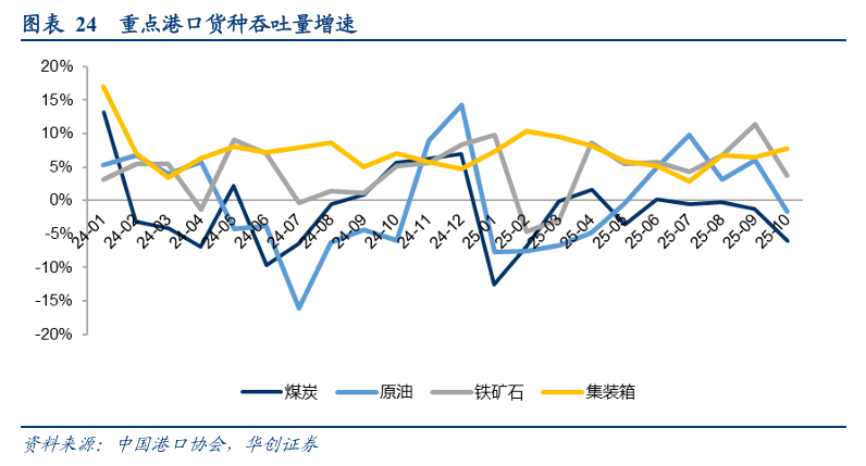 2025年1-10月,集装箱( 6.9%)>铁矿石( 4.9%)>原油(-0.1%)>煤炭(-2.9%)。