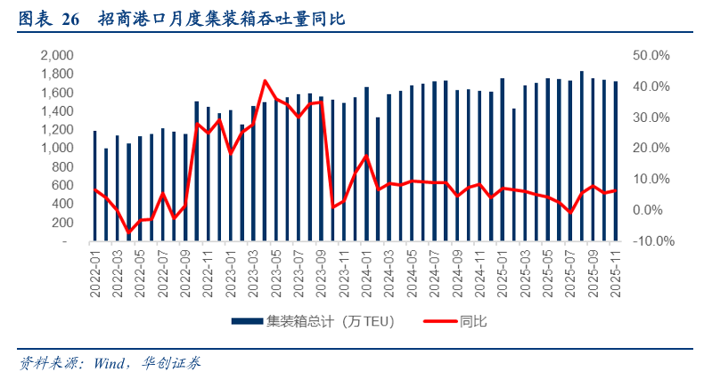 2025年11月,招商港口完成集装箱吞吐量1724.8万TEU,同比 6.4%,完成散杂货吞吐量10034.4万吨,同比-1.4%。