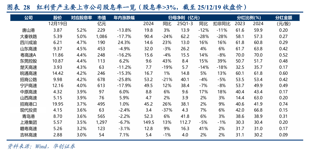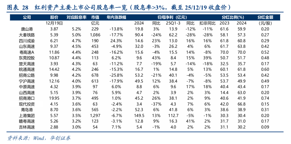 大于4%:唐山港(5.2%)>大秦铁路(5.0%)>四川成渝(4.7%)>山东高速(4.5%)>粤高速A(4.4%)>东莞控股(4.4%)>楚天高速(4.3%)>皖通高速(4.2%)>招商公路(4.2%)>宁沪高速(4.0%);