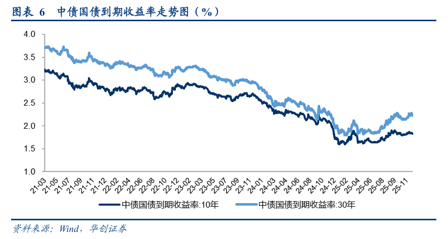 截至2025/12/19,10年中债国债到期收益率为1.83%,较2025/11/30的1.84%下跌1bp,30年中债国债到期收益率2.23%。