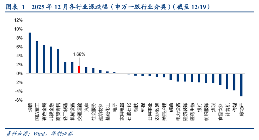 2025年12月1日至12月19日,交通运输行业累计上涨1.68%,跑赢沪深300指数0.76pct,涨跌幅在31个申万一级行业中排名第8。