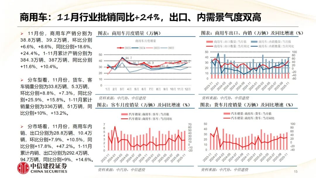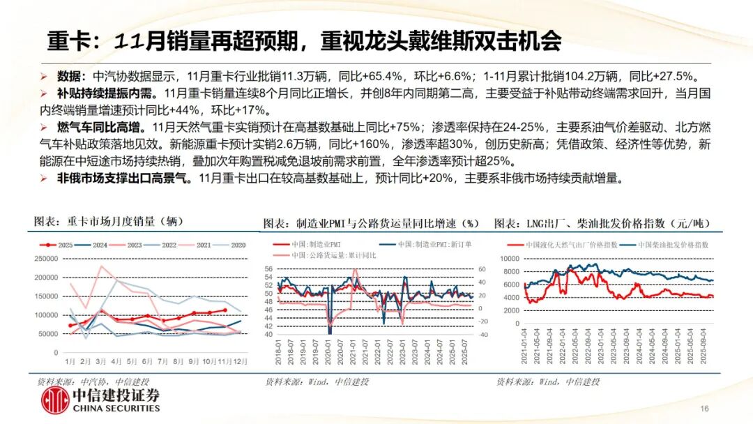 商用车板块,年末重卡、客车有望延续高景气,重视短期催化 中期低估值配置机会。1)重卡:考虑到国内补贴效果持续显现,次年政策切换驱动部分需求前置,叠加非俄出口高增速延续,年底前行业预计维持较高景气,有利于短期估值修复。26年国内国四、国五自然报废叠加出口高增,预计可支撑行业总量保持110万 高位,且传统能源基盘有望保持稳定。