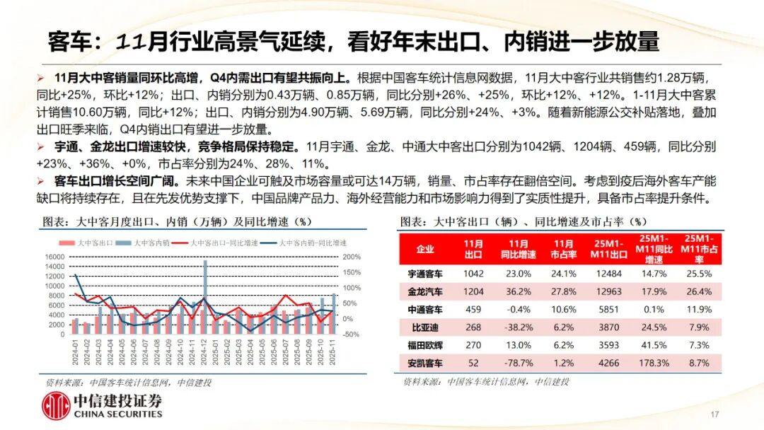 2)客车:随着新能源公交补贴落地,叠加出口旺季来临,年底前客车内销、出口有望进一步放量。重点公司年内仍有估值上行空间及业绩超预期机会。