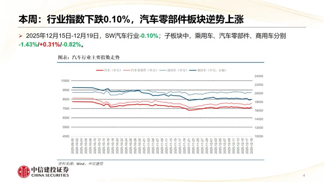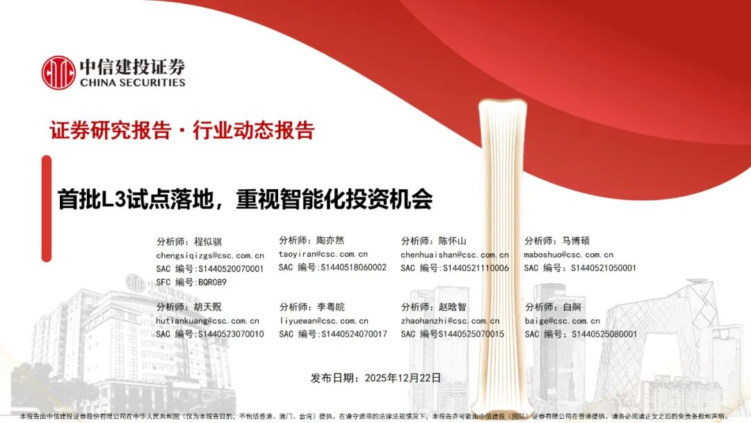 当前市场对汽车明年刺激政策及产销总量预期较弱,汽车顺周期属性弱化,目前来看预期或已见底,科技属性下机器人及无人驾驶等成长方向仍是核心主线。工信部许可重庆、北京两家主机厂各一款L3级自动驾驶车型产品,标志着我国L3自动驾驶迈入商业化应用关键一步,我们看好自主乘用车智能化、高端化、强势新车周期和新能源出海头部车企。