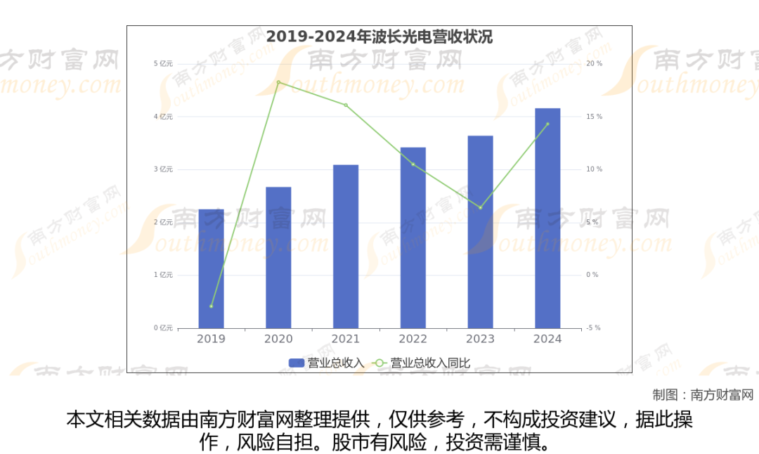 据波长光电2024年全年业绩显示(如上图),公司营业收入为4.16亿,同比增长14.32%,近5年复合年增长率11.77%。
