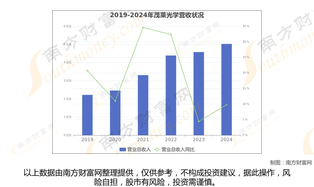 根据公司年度数据显示(如上图),2024年,茂莱光学实现营业总收入5.03亿,同比增长9.78%,近5年复合年增长率19.54%。