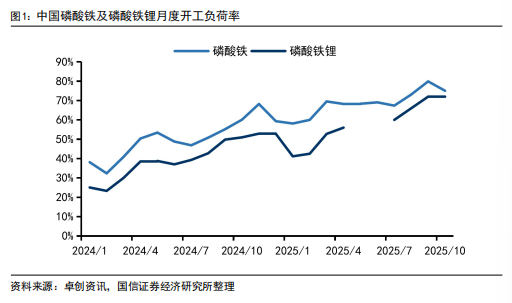 2025年下半年,锂电行业呈现显著的复苏态势,全产业链排产与开工率稳步提升。据卓创资讯,磷酸铁开工率从1月的58%升至10月的75%;磷酸铁锂开工率由1月的41%升至10月的72%;六氟磷酸锂开工率同步从43%跃升至80%。伴随产能释放,产品价格强势反弹,六氟磷酸锂价格从年初6万元/吨飙升至12月的约17万元/吨,磷酸铁锂价格也由3.6万元/吨涨至超4万元/吨,反映下游需求持续向好。旺盛的含磷材料需求进一步传导至上游,拉动磷矿石及高纯磷酸等原料的消费,支撑磷化工产业链景气度回升。